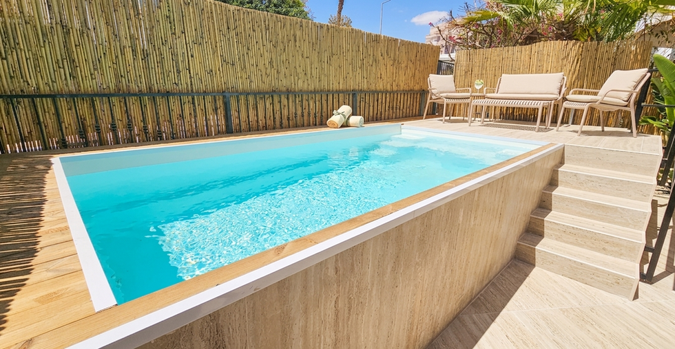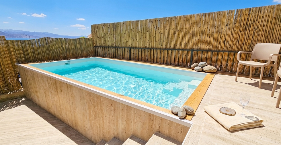 2 חדרי שינה, 2 חדרי שרותים עם מקלחת סלון ,פינת אוכל,מטבח המאובזר בכל הנדרש בכלי בישול וחצר עם בריכה פרטית .